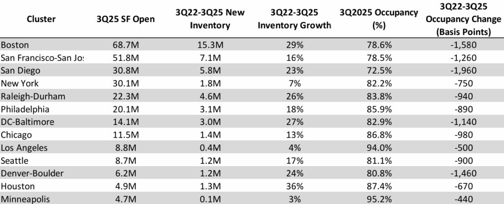 Life Science real estate has been on a clip of fast expansion, fueled by the increased investor attention and heightened space demand the sector experienced in the wake of the pandemic. But what cluster areas have seen the most significant increases in inventory? Boston tops the list with inventory growing by almost a third since 3Q22. Several emerging markets have also posted remarkable growth—DC–Baltimore and Raleigh–Durham have each increased their inventory by roughly 27% and 26% respectively, adding millions of square feet.