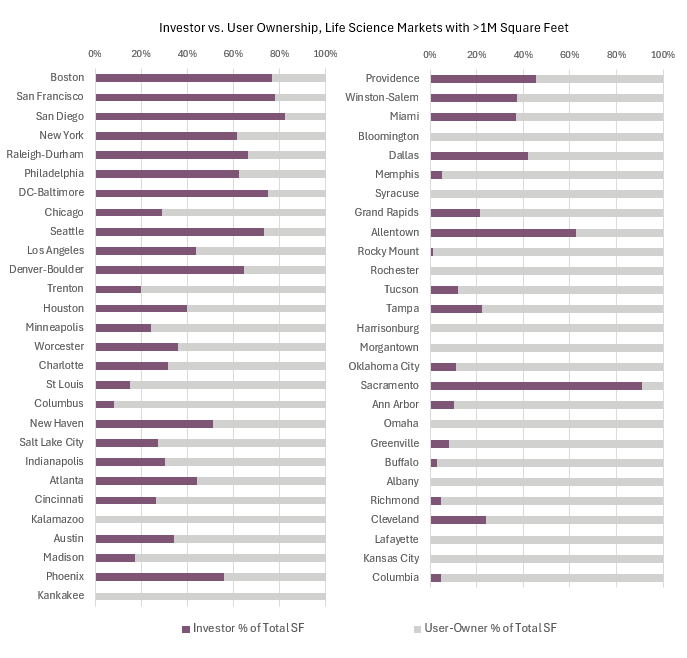 A common profile for smaller markets is a historically industrial city that now contains a manufacturing campus for pharmaceuticals, biotech, medical devices, etc. Some examples from the chart are Kalamazoo (Pfizer campus) and Syracuse (Lotte Biologics). These two markets, as well as a handful of others, are completely owned by users, so there is zero investor presence. While this is common, there are some small life science markets that have gained investor attention like New Haven, Phoenix, Allentown, and Sacramento. These four markets have more than 50% investor ownership and fall into the size category of 1-3 million square feet. Three of the four, with Sacramento being the exception, have dodged the recent occupancy troubles found in the large, investor driven markets.