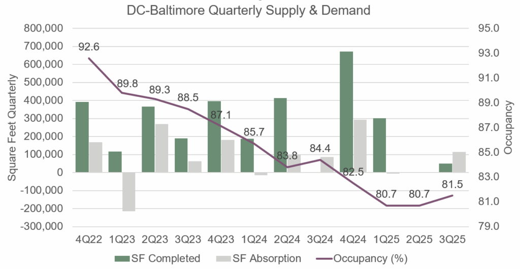 But there may be early signs of stabilization in some of the emerging clusters. One such area is the DC–Baltimore region. This market may not have been top-of-mind as a recovery leader given its proximity to government institutions and the political uncertainty that surrounds them. Yet, in 3Q, occupancy rose 80 bps to 81.5%, bucking the national trend. With a small, fully leased construction pipeline, DC–Baltimore is well-positioned to continue to absorb existing vacancies.