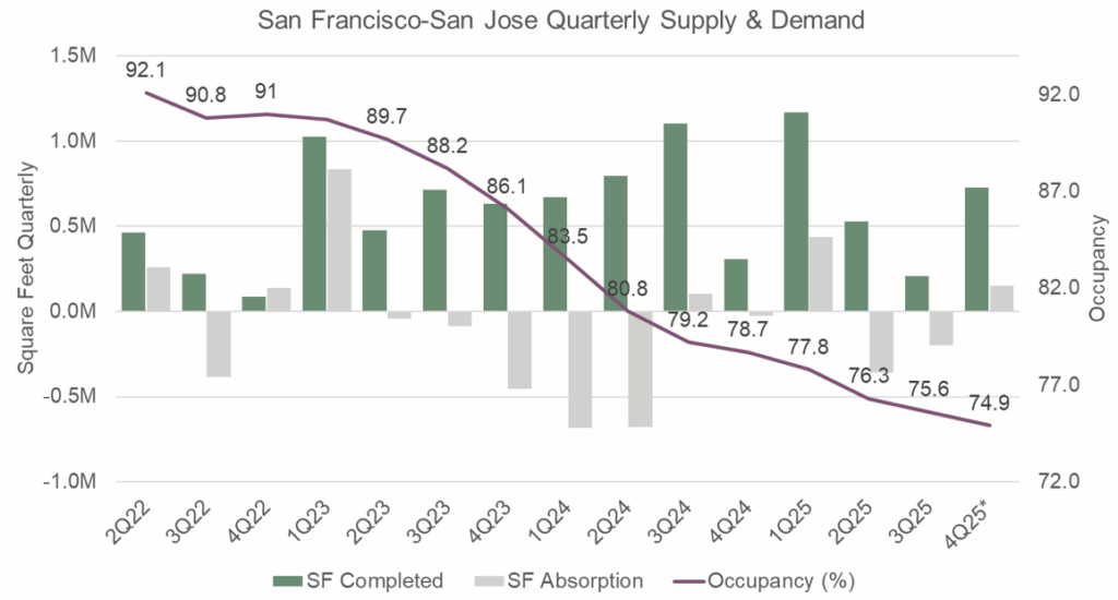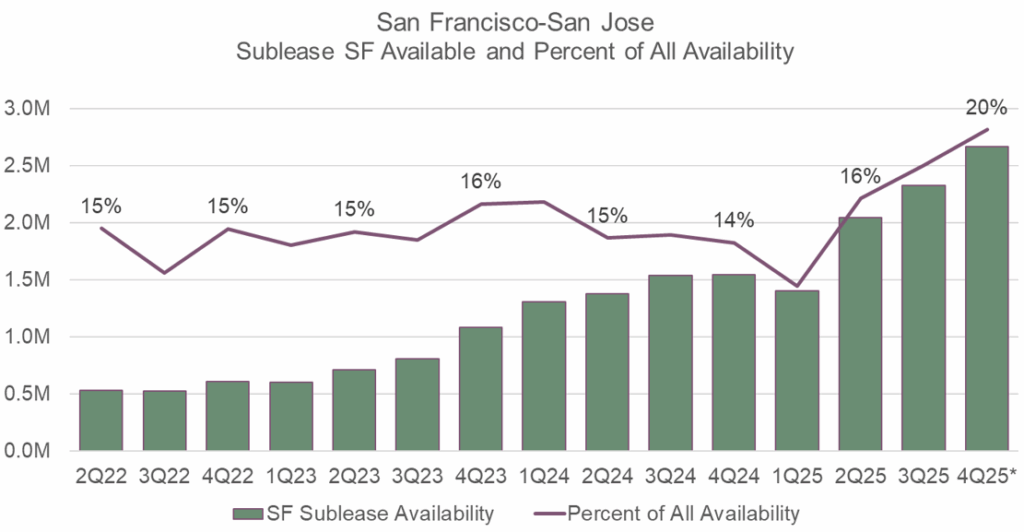 While several U.S. life science markets have begun to stabilize or show early signs of recovery, San Francisco/San Jose remains in a period of adjustment as new supply continues to deliver alongside limited demand. Market occupancy continues to deteriorate; preliminary data for Q4 shows occupancy at 74.9% for all life science properties and 69.0% for investor-owned assets only. A significant driver of this deterioration throughout 2025 has been the increase in new sublease availability. In Q1 of this year, 1.4 million square feet was available for sublease, representing 12% of total availability. Preliminary Q4 data shows this nearly doubled to 2.7 million square feet, now accounting for 20% of total available space. For comparison, San Diego’s availability is 14% sublease offerings and Boston is only 10%.